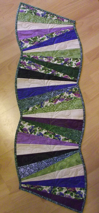 Ich habe diesen aus meiner neuen Serie "Budding" genäht und noch ein paar andere dazu getan. ich habe ihn in den nähten gequiltet und das sah nicht schön aus, also eigentlich nach nichts. Somit habe ich den Läufer bei Martina Lippert zum Long-Arm-Quilten abgegeben. Ich finde jetzt sieht er fantastisch aus.