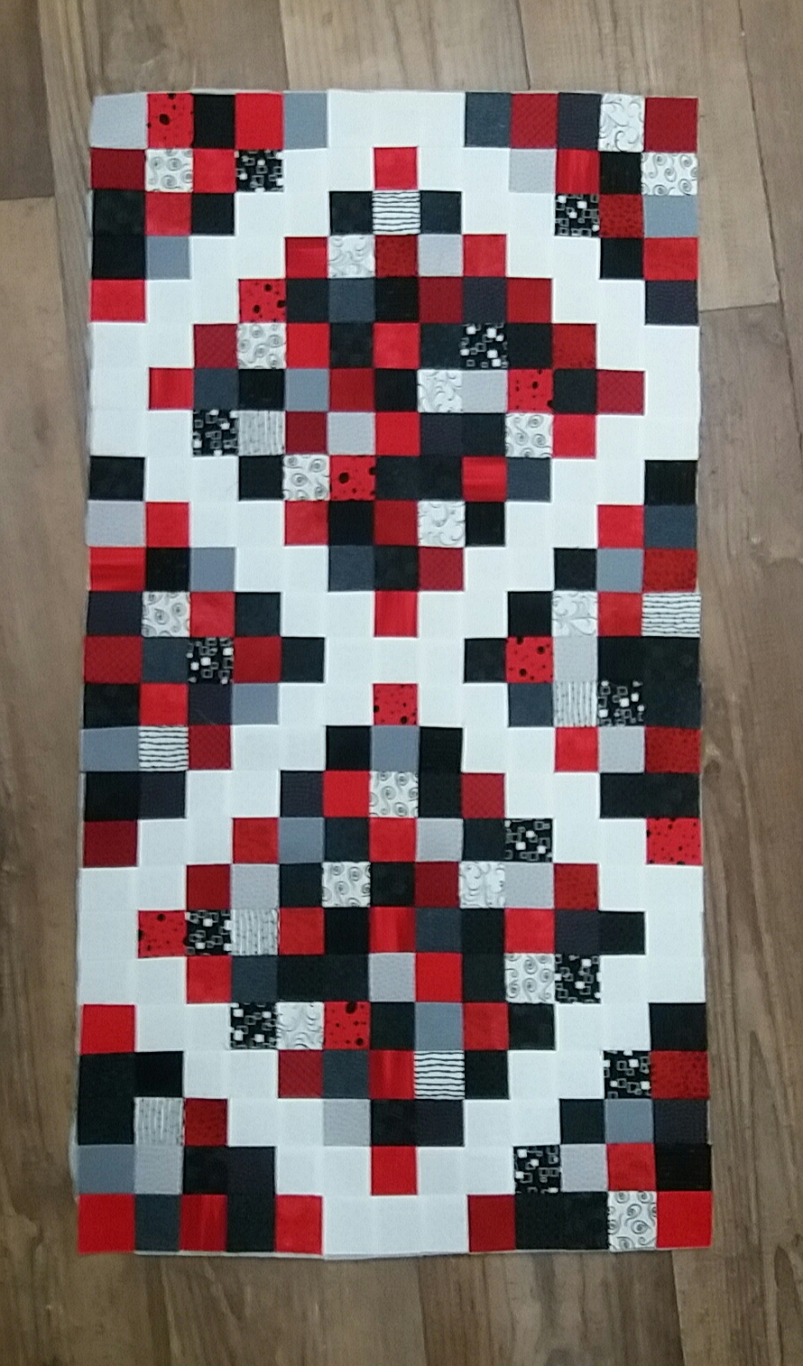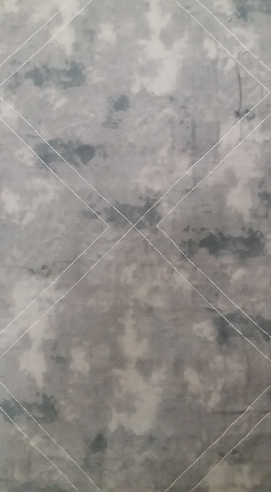 Ich habe mich für einen grauen Marble Rückseiten stoff entschieden und quilte wie beim Kissen die Weißen Quadrate diagonal ab, diesmal beide Reihen. Leider kommt das vorne nicht so zur Geltung.